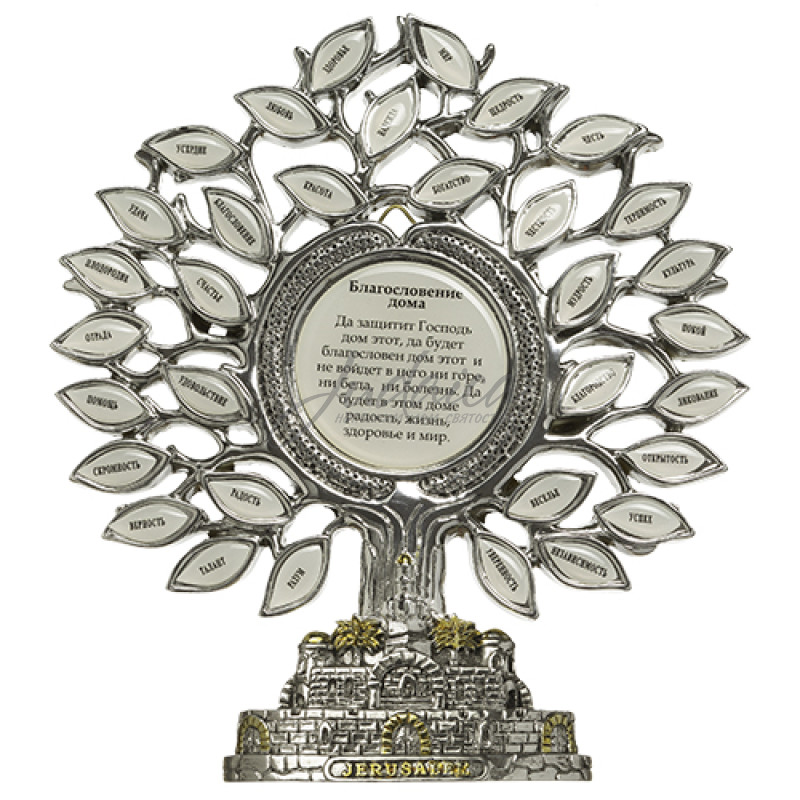 Благословение для дома "Дерево" украшено лепестками с различными пожеланиями на русском языке, на подставке, украшенной панорамой Иерусалима.