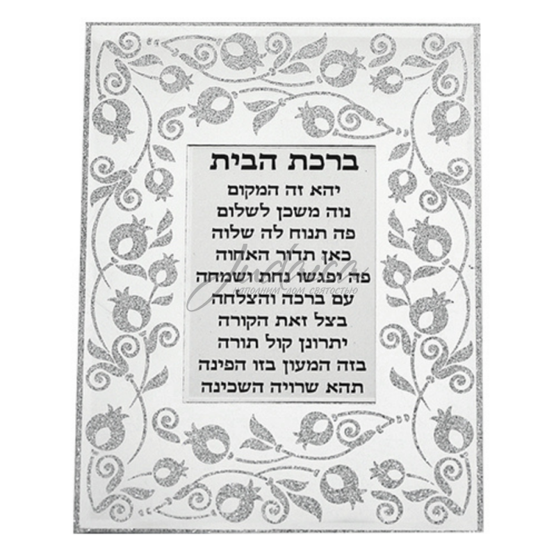 Благословение для дома в рамке с зеркальной поверхностью. Особую привлекательность ему придает изображение гранатов россыпью серебристых блесток. Гранат - один из символов изобилия и плодородия Земли Израиля. Такое благословение освятит Ваш дом, а также станет прекрасным дополнением к интерьеру.