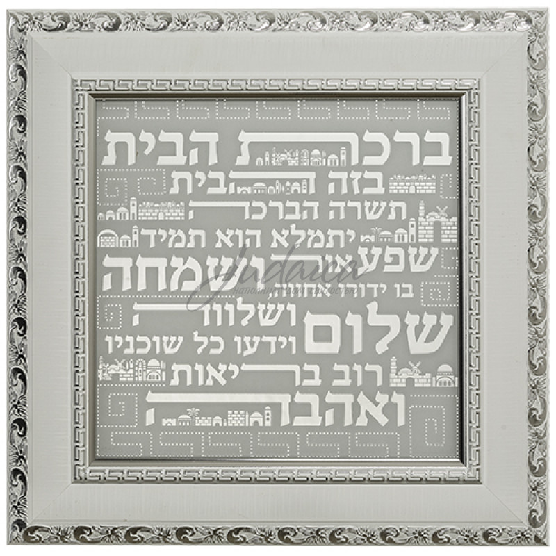 Благословение для дома выполнено в необычном дизайне с Иерусалимскими мотивами. Отличием этого благословения от других является красиво декорированная серебристая рамка, которая придает всей картине целостность.