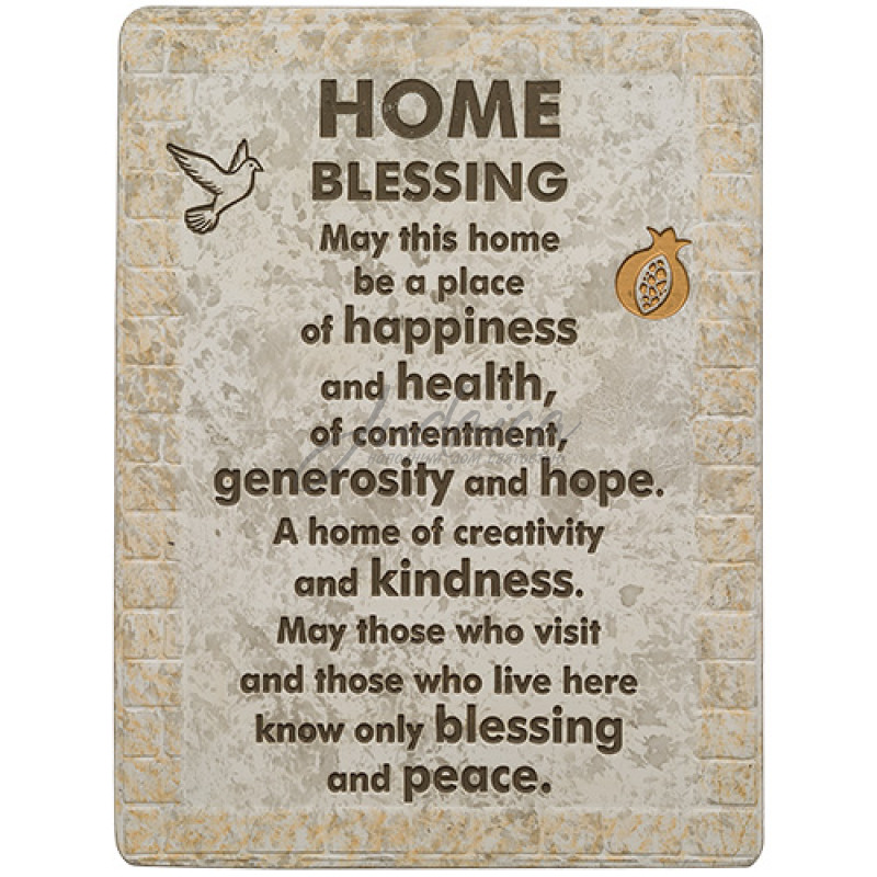 Благословение для дома "Stone" на английском языке — это стильное украшение, выполненное под натуральный камень. Оно несёт в себе тёплые слова о желании счастья, здоровья, гармонии, великодушия и надежды для всех, кто находится в доме. На табличке изображены символы мира и благополучия — голубь и Хамса, приносящие в дом спокойствие и благословение.