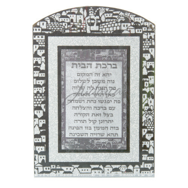 Очень красивое благословение для дома на иврите, выполненное из органического стекла, за счет чего уход за ним не составит никаких проблем. Особенностью этого благословения является изображение Иерусалима серебристыми блестками, которые сверкают и переливаются на свету. Такое благословение несомненно украсит Ваш дом, а также отлично подойдет на подарок.