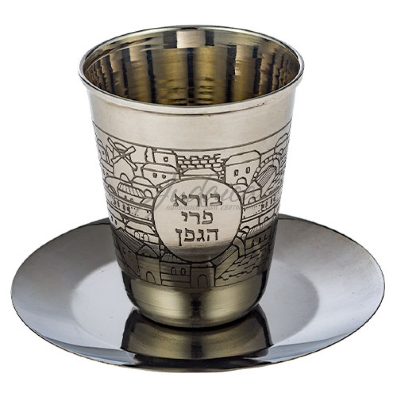 Традиционный бокал для кидуша с блюдцем, небольшого размера с надписью "Борэ при агофэн", согласно еврейскому закону содержит ревиит (объем 86 мл). Бокал придется по душе любителям минимализма.