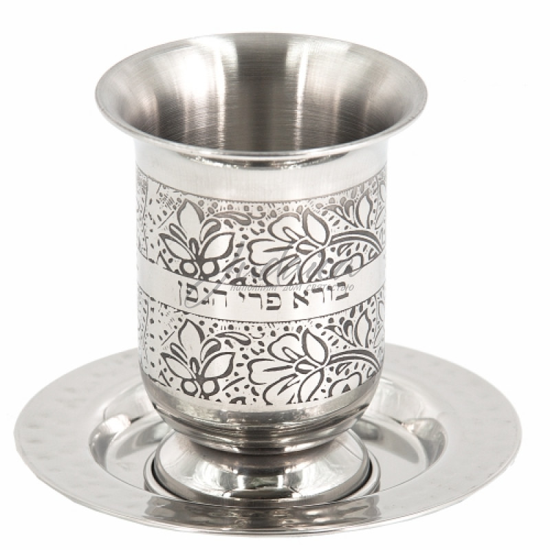 Красивый бокал для кидуша с блюдцем, гравировкой "Цветы" и благословением.