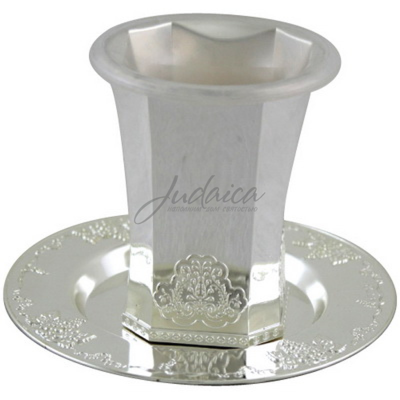 Традиционный бокал для кидуша с блюдцем в красивом дизайне. В комплект входит съемная чашечка.