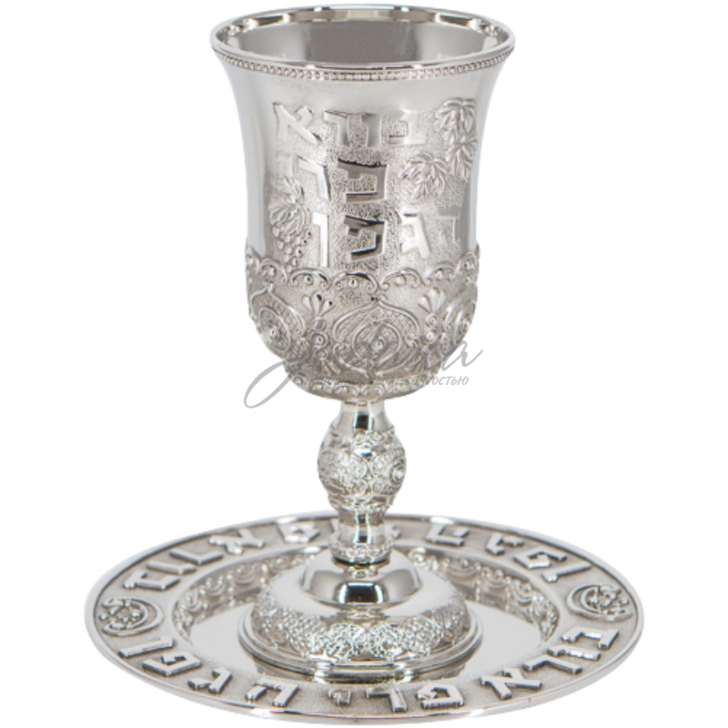 Изысканный бокал для кидуша на ножке с блюдцем украшен украшен изящными узорами и надписью на иврите "Борэ при а-гафен". В комплекте съемная чашечка.