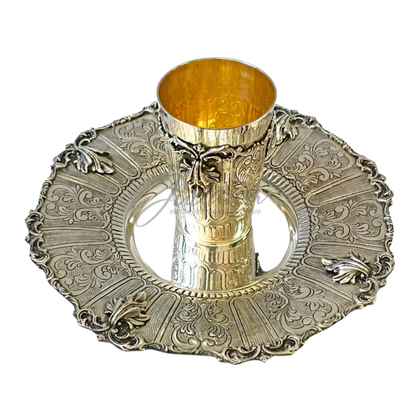 Бокал для кидуша с блюдцем SD-999, покрытый серебром, представляет собой элегантный и утончённый комплект для проведения ритуала кидуша. Этот набор выполнен с изящным орнаментом, который придаёт ему особую изысканность и делает его идеальным украшением праздничного стола.