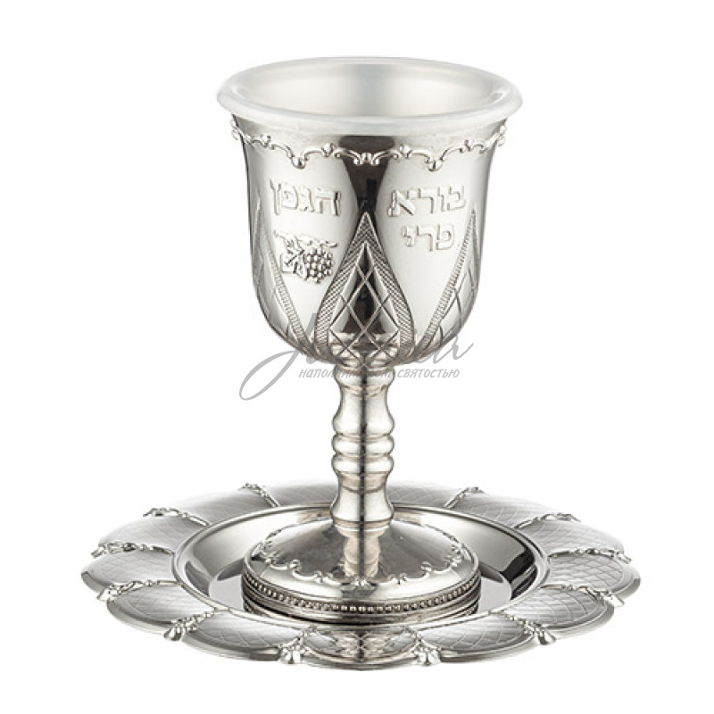 Элегантный бокал для кидуша на ножке, украшен надписью "Борэ при агофеэн", а также красивыми орнаментами. Бокал выполнен из высококачественного никеля, в комплекте идет блюдце и съемная чашечка.
