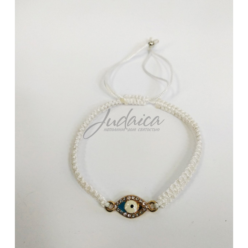 Белый плетенный браслет украшен глазом, который инкрустирован декоративными стразами.