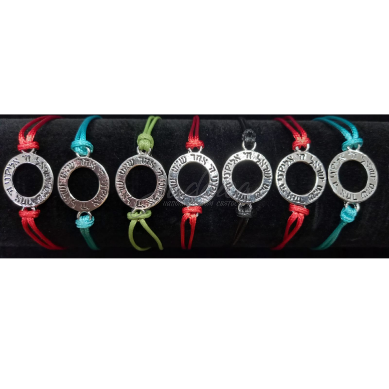Браслет с серебристым кольцом, на котором написана строка одной из самых главных еврейских молитв - "Шма Исроэль". Браслет подойдет на любую руку, за счет удлиняющей цепочки.