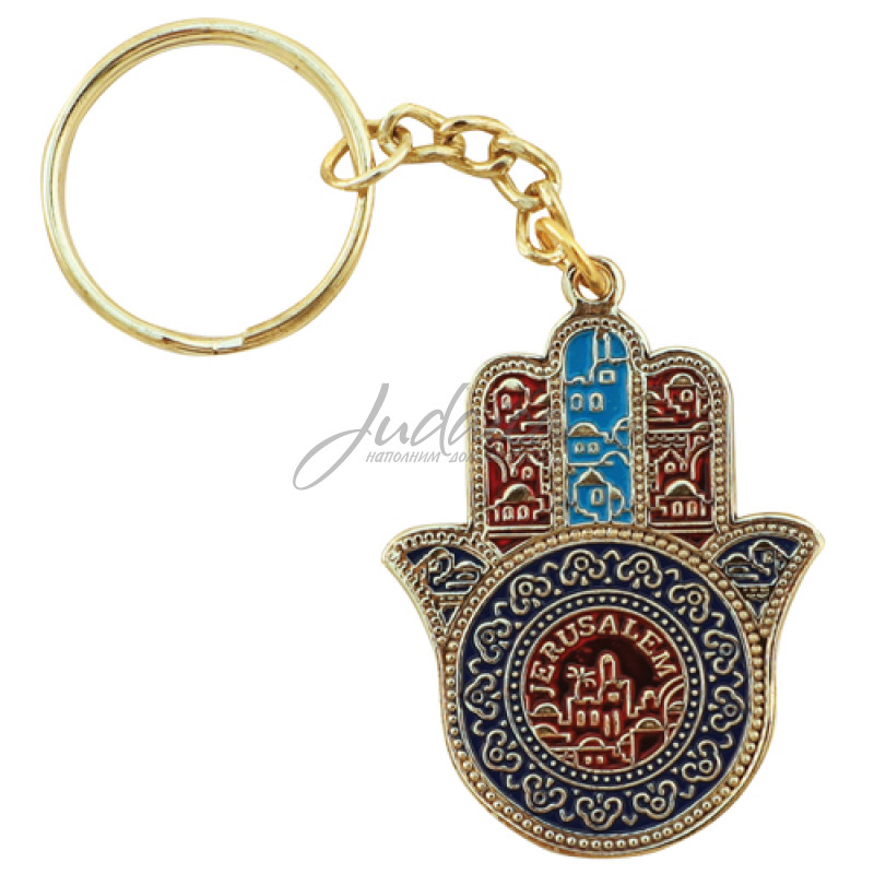 Брелок в форме Хамсы с Иерусалимскими мотивами. На обратной стороне - дорожная молитва на английском языке.