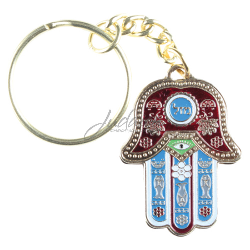Компактный брелок в форме Хамсы с символами иудаизма, а также надписью "Мазаль", что означает в удача переводе с иврита. На обратной стороне - дорожная молитва на иврите.