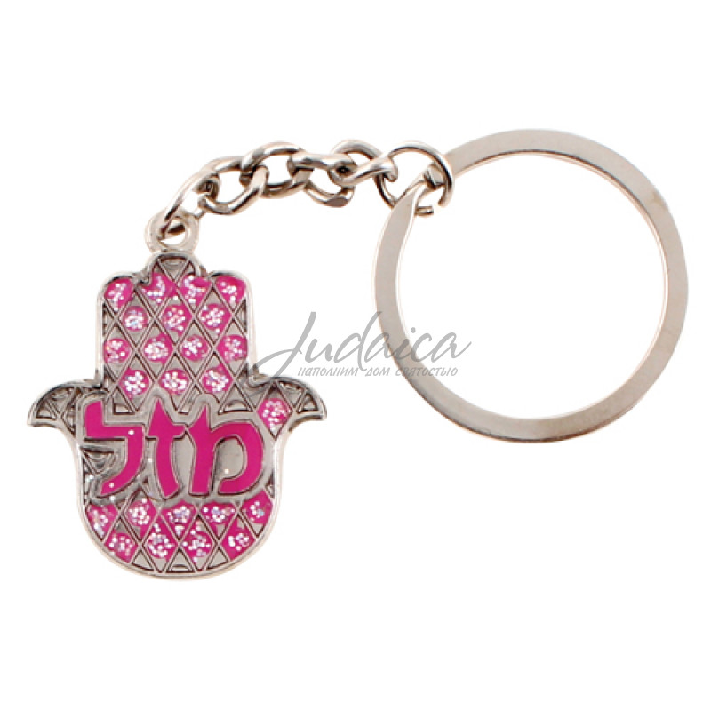 Компактный брелок в форме Хамсы с надписью "Мазаль", что в переводе с иврита означает удача. Особенностью этого брелка - покрытие розовыми блестками, которые чудесно его дополняют и украшают. На обратной стороне - дорожная молитва на иврите.