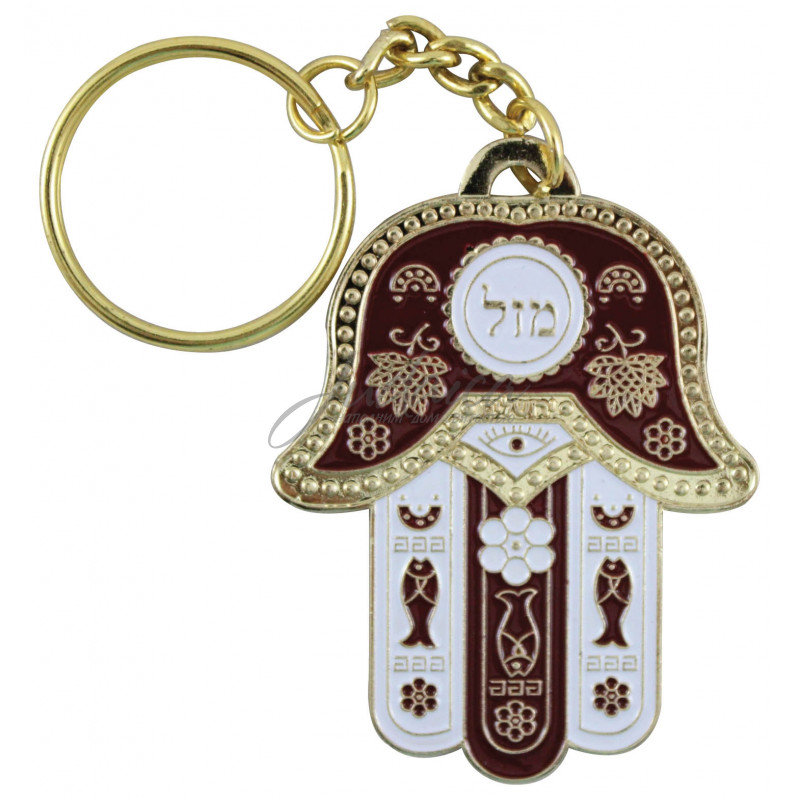 Брелок в форме Хамсы, украшен еврейскими символами плодородия и изобилия, а также надписью "Мазаль" - перевод с иврита удача. На обратной стороне - дорожная молитва на иврите.