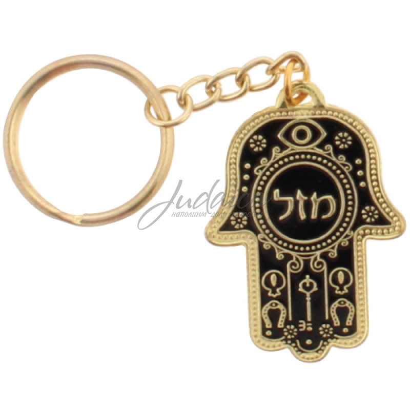 Компактный брелок в форме Хамсы черного цвета с надписью "Мазаль", в переводе с иврита удача. На обратной стороне - дорожная молитва на иврите.