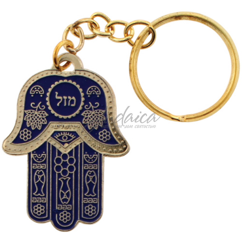 Брелок в форме Хамсы в насыщенно синем цвете с символами плодородия с надписью "Мазаль", что в переводе с иврита означает удача. На обратной стороне - дорожная молитва на иврите.