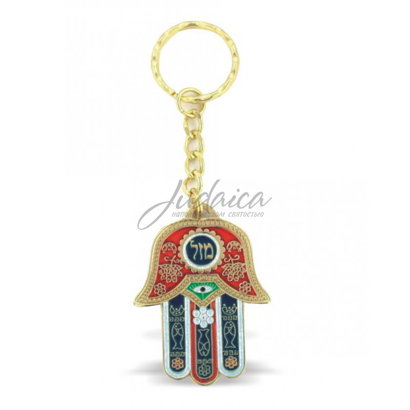 Компактный брелок в форме Хамсы, украшен еврейскими символами и надписью "Мазаль", что в переводе с иврита означает удача. На обратной стороне - дорожная молитва на иврите.