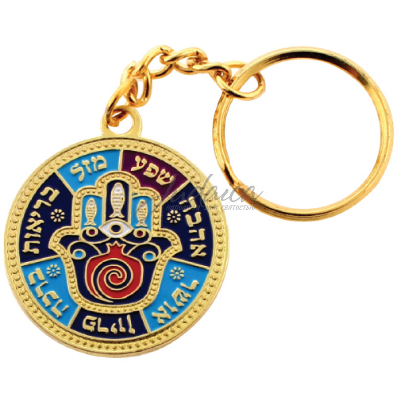 Круглый брелок с пожеланиями на иврите - любовь, удача, здоровье, благополучие, процветание. Украшение брелка - Хамса с изображением рыб и граната, которые символизируют в иудаизме плодородие и богатство.
