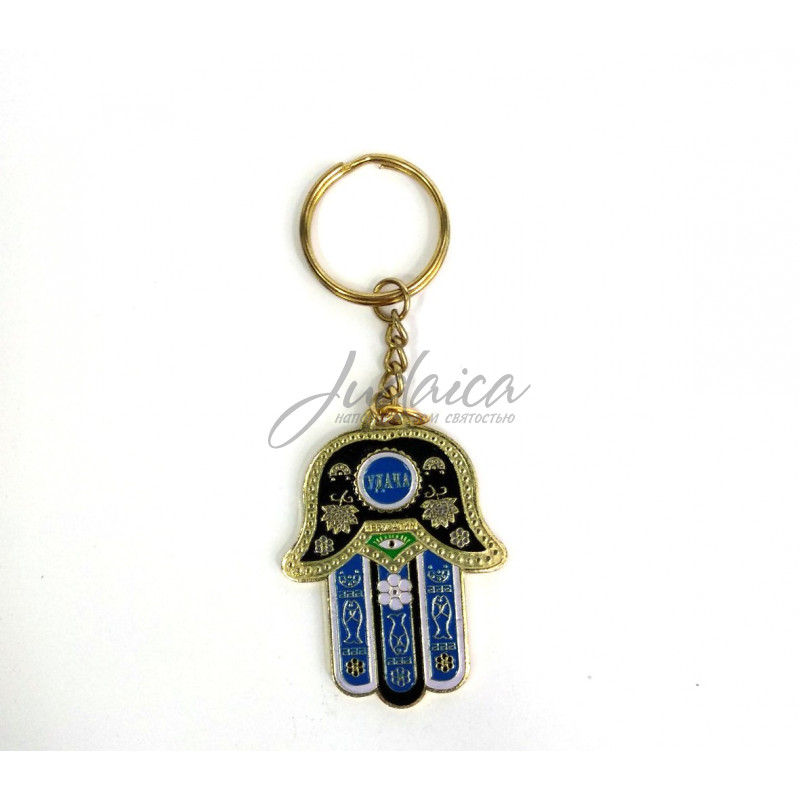 Компактный брелок в форме Хамсы с символами плодородия и надписью удача. На обратной стороне - дорожная молитва на русском языке.