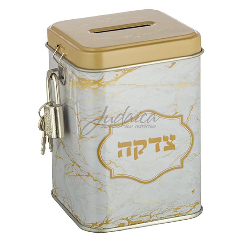 Цдака «Марбел» высотой 10 см выполнена из металла с мраморным узором и золотистыми акцентами. Оснащена удобным замком с ключом для надёжного хранения пожертвований. Компактный размер позволяет разместить её в любом удобном месте дома или офиса.