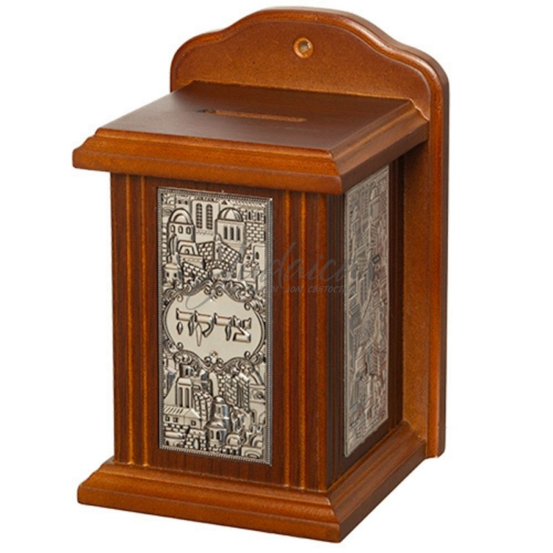 Деревянная коробочка для цдаки украшена элегантной металлической пластиной с изображением Святого города Иерусалима. Такая коробочка для цдаки будет замечательным напоминанием о выполнении заповеди о благотворительности.