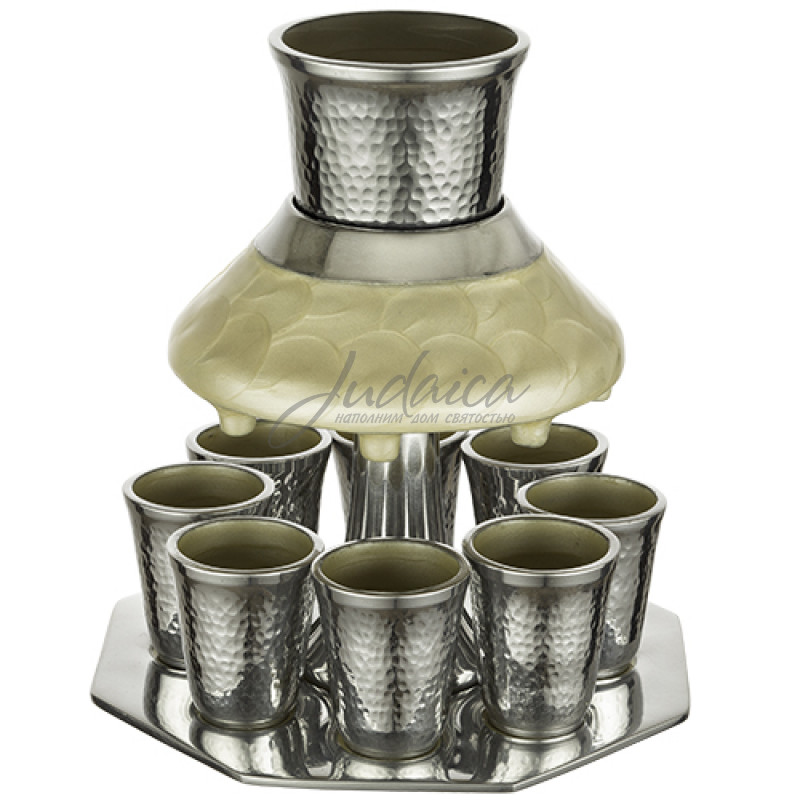 Фонтан для кидуша станет отличным украшением Шаббатнего стола. Фонтан украшен акриловой эмалью жемчужного цвета. В комплекте есть 8 чашечек.