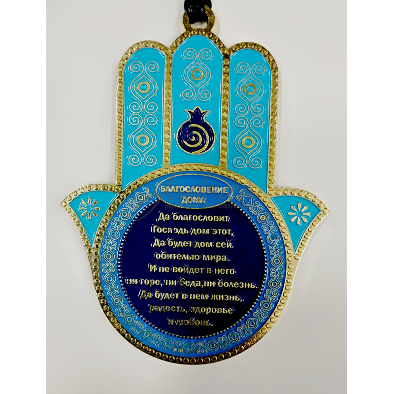 Компактное благословение для дома в форме металлической хамсы, текст на русском языке. Украшено гранатом - символом изобилия и плодородия.