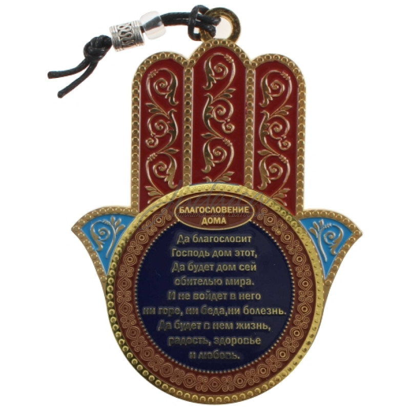 Металлическая хамса рубинового цвета с текстом благословения для дома на русском языке.