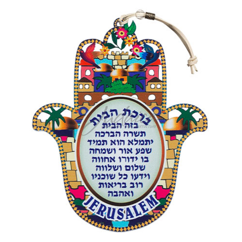 Хамса с благословением для дома. Выполнена из металла и украшена ярким принтом.