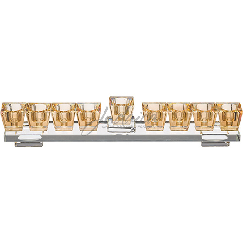 Ханукия "Golden Crystal"– стильный ханукальный светильник с прозрачной стеклянной основой и золотистыми свечными держателями. Современный минималистичный дизайн делает его украшением праздничного стола. Прочная и устойчивая конструкция подходит для стандартных свечей.