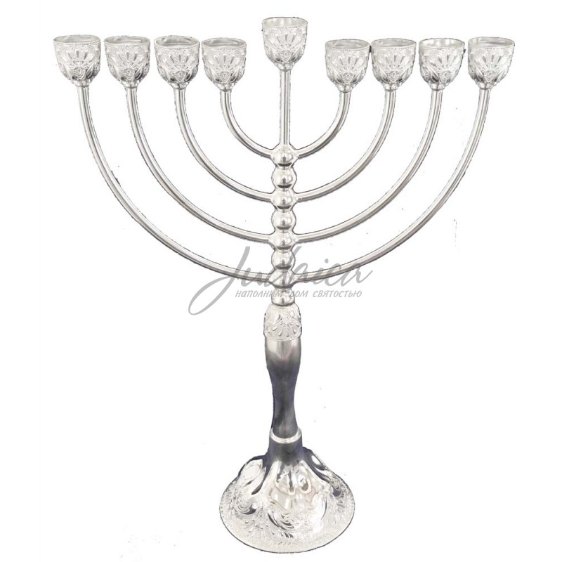 Изысканный ханукальный светильник, покрытый серебряным напылением и украшен декоративными узорами. Такая Ханукия станет не только отличным подарком и украсит любой дом или офис, а и будет предметом святости и приобщения к народу.