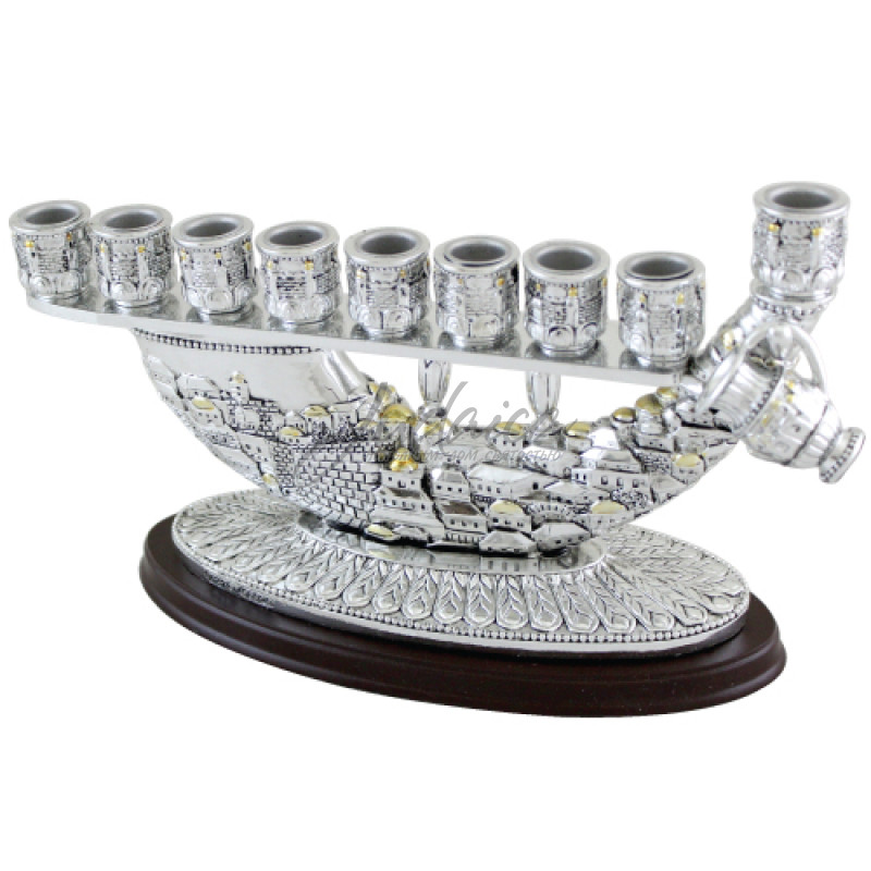Ханукия «Шофар» выполнена в форме шофара с устойчивой основой и декоративными элементами, отражающими мотивы Иерусалима. Конструкция обеспечивает удобство для размещения свечей или масла, а прочные материалы гарантируют долговечность изделия. Идеально подходит для использования в праздничные дни Хануки, сочетая функциональность и традиционное оформление.