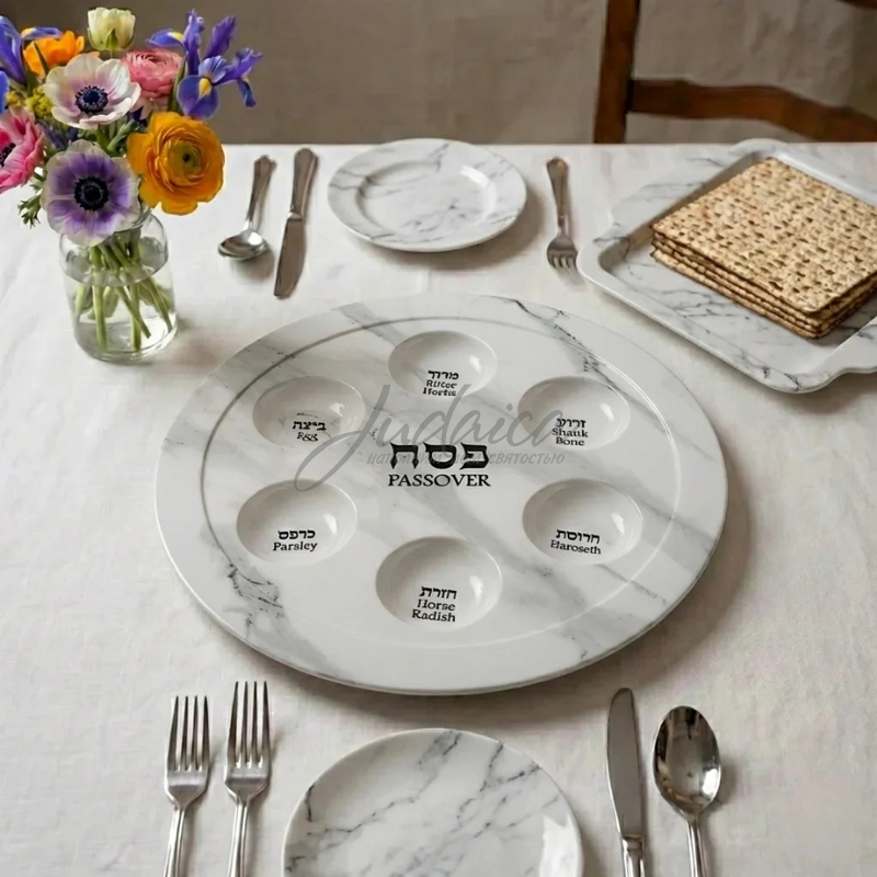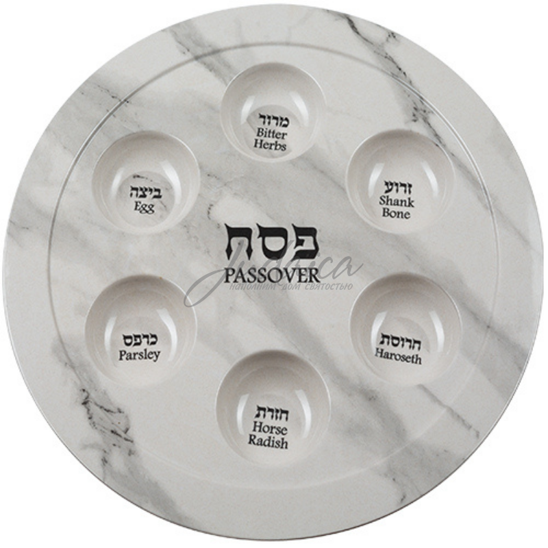 Легкая и прочная кеара из меламина в цветовой гамме белого мрамора украсит ваш пасхальный стол, В центре кеары - слово "Песах" на иврите и на английском. В углублениях пасхальной тарелки нанесены надписи, указывающие место каждого из 6 символических видов пищи, которые необходимо съесть во время Седера, на иврите и на английском языке.