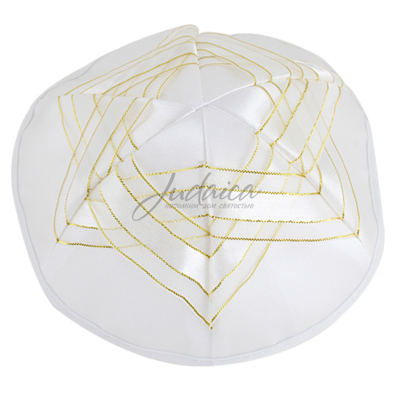 Кипа изготовлена из атласа, украшена большой Звездой Давида и люрексовой золотой нитью. Будет отличным дополнением к праздничному дню.