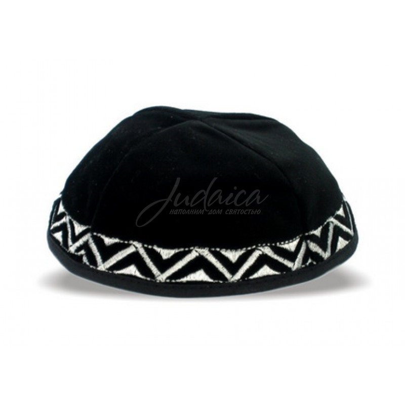 Традиционная черная бархатная кипа с орнаментом- зигзаги. Высококачественный натуральный бархат. Хорошо держит форму.