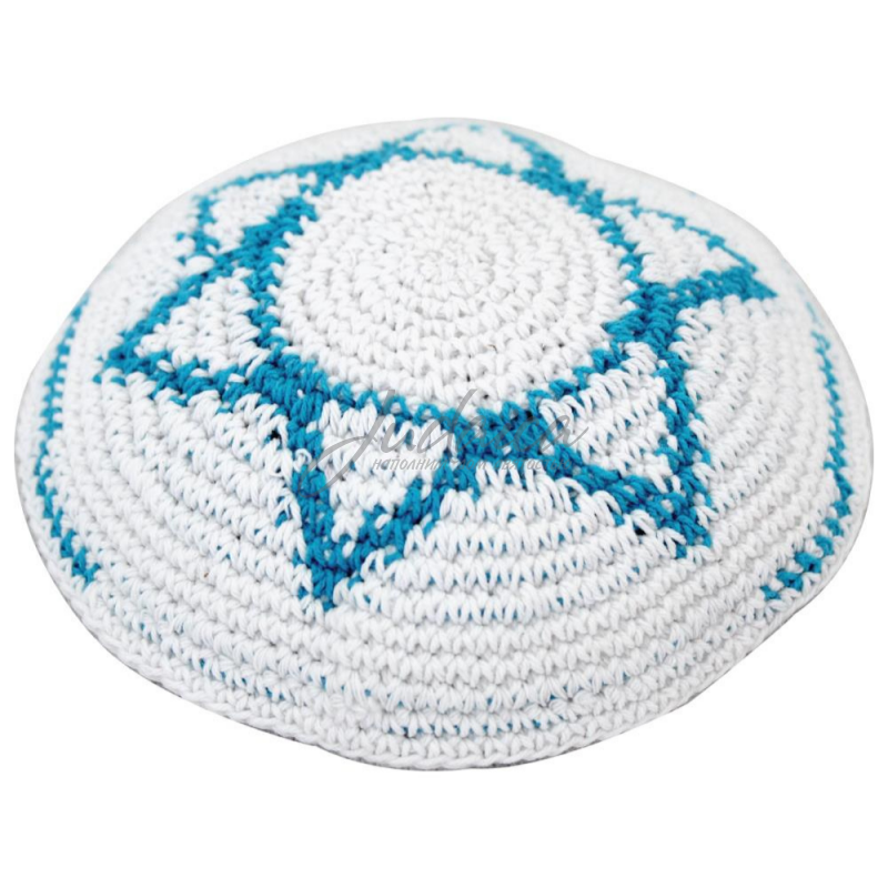 Бело-голубая кипа машинной вязки. Украшена большой Звездой Давида и волнообразными полосами.