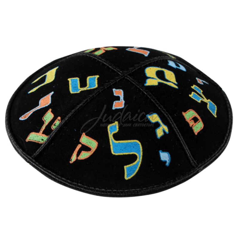 Замшевая детская кипа черного цвета с кромкой, украшена буквами еврейского алфавита.