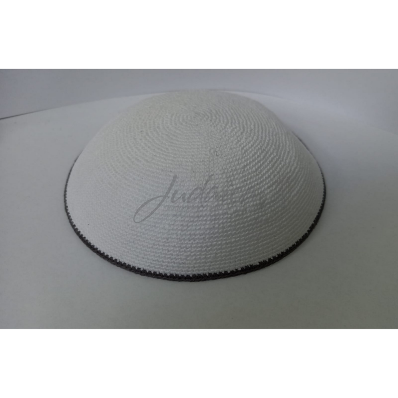 Белая вязаная кипа в минималистичном стиле. Украшена серой окантовкой. Кипа изготовлена из высококачественных ниток ручной работы. Хорошо держит форму.