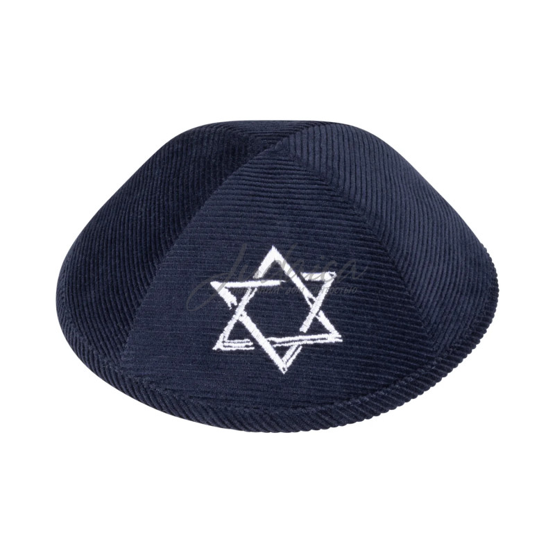 Кипа "Navy Corduroy - White Star" выполнена из темно-синего вельвета, который придает изделию текстурный и стильный вид. На передней части кипы вышита белая звезда Давида, что подчеркивает её традиционное еврейское значение. Кипа имеет аккуратные швы и обеспечивает комфортное ношение и хорошую посадку на голове. Этот аксессуар сочетает в себе классический дизайн и современные элементы, делая его идеальным выбором для повседневного ношения или особых случаев.