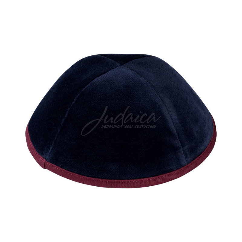 Бархатная кипа в трендовом темно-синем цвете, украшением которой является бордовая окантовка. Прекрасно держит форму. Есть подкладка и место для заколки. Кипа представлена в разных размерах: 3, 4, 5 и 6. При заказе, указывайте необходимый размер.