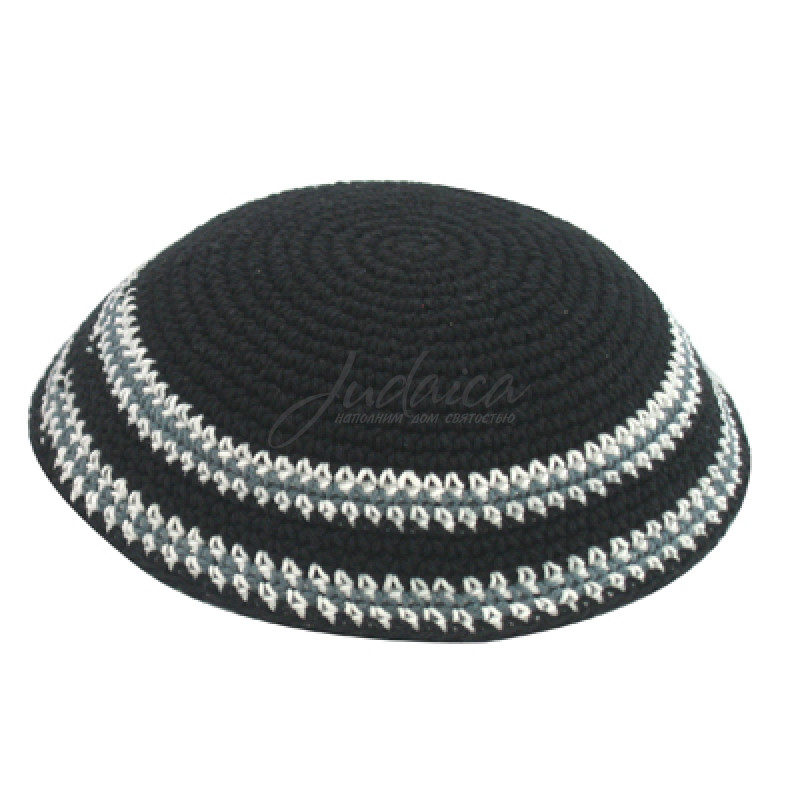Кипа вязаная, черная с белым узором, небольшая.