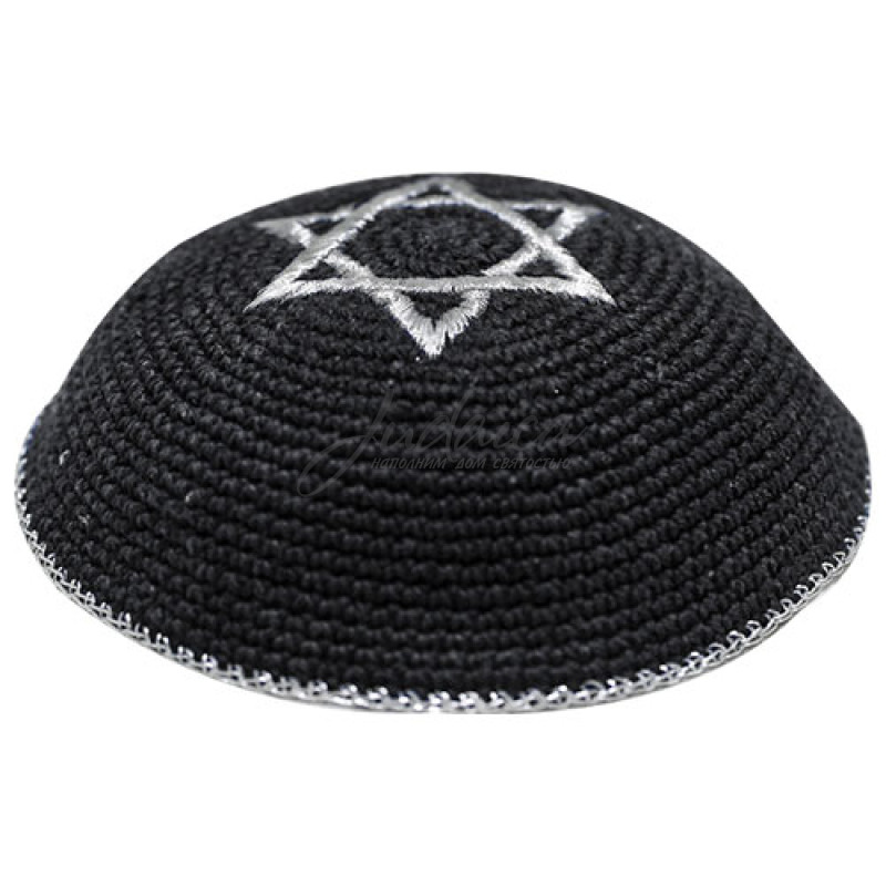 Вязаная кипа чёрного цвета украшена вышивкой звезды Давида, подчёркивающей её традиционный стиль. Благодаря прочной вязке и удобной посадке, кипа идеально подходит для ежедневного ношения и праздничных мероприятий. Практичный выбор, сочетающий удобство и символизм.