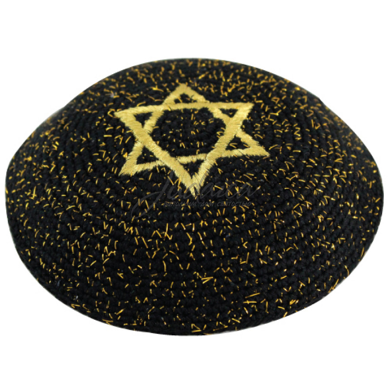 Вязаная кипа украшена Маген Давидом (Звездой Давида) и люрексовой золотой нитью, машинная вязка.