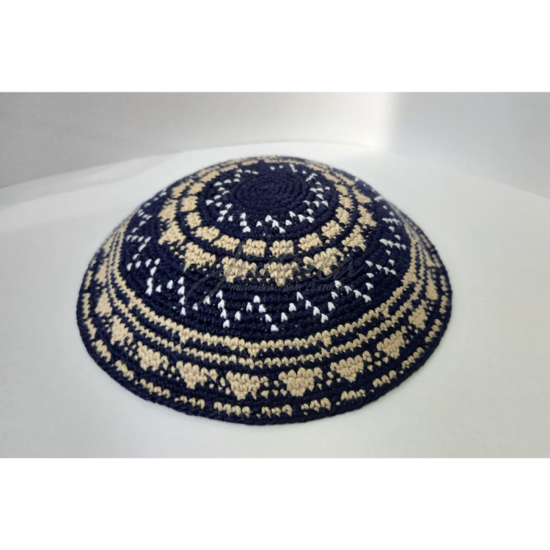 Вязаная кипа с красивым сочетанием бежевых узоров на синем фоне. Ручная работа. Изготовлена из высококачественных ниток.