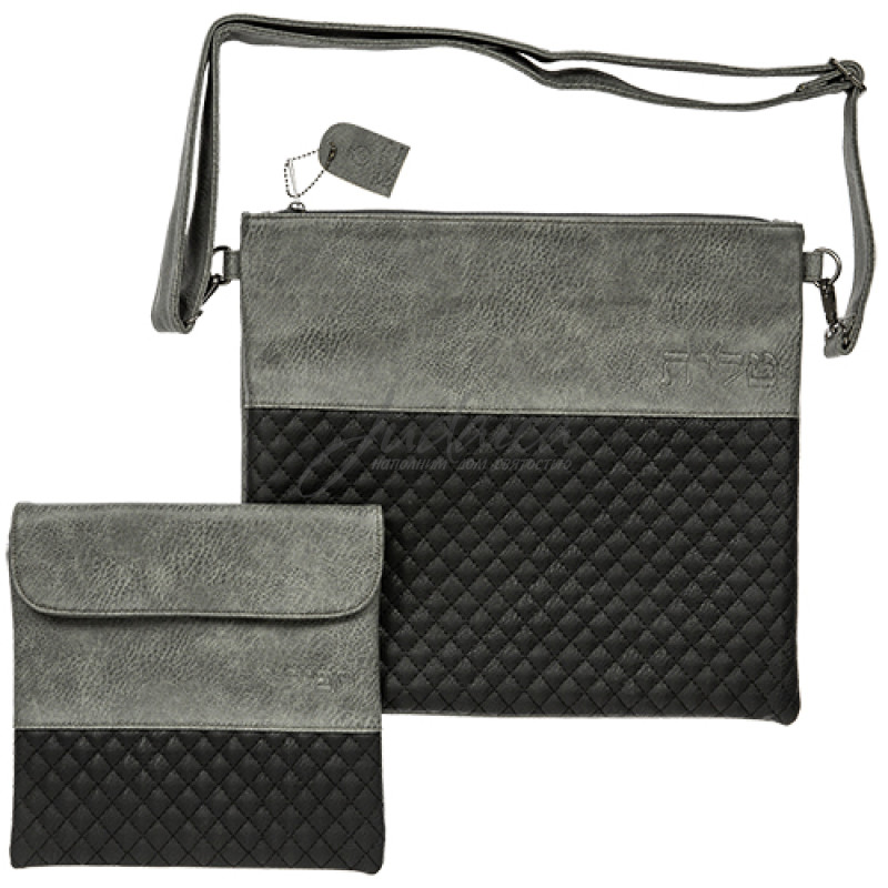 Набор сумок для таллита и тфилин выполнен из искусственной кожи черного и серого цветов, украшен ромбовидным узором.