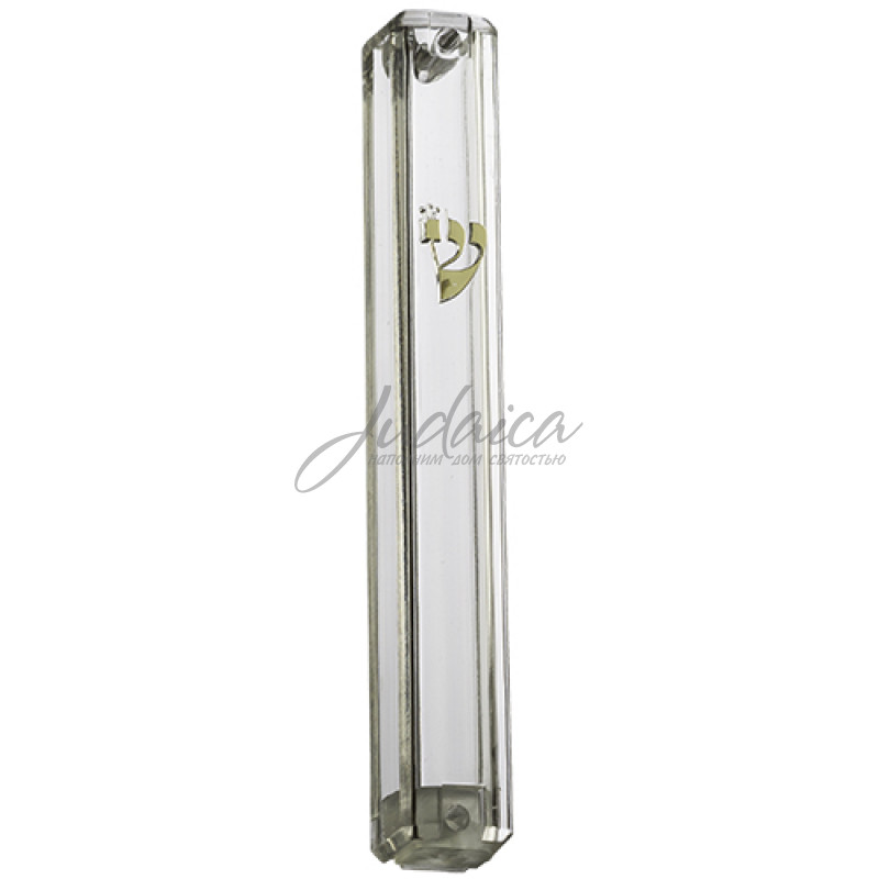 Прозрачный футляр для мезузы, украшен серебристой буквой "Шин". За счет своей герметичности футляр является водонепроницаемым, что обеспечивает сохранность мезузы.