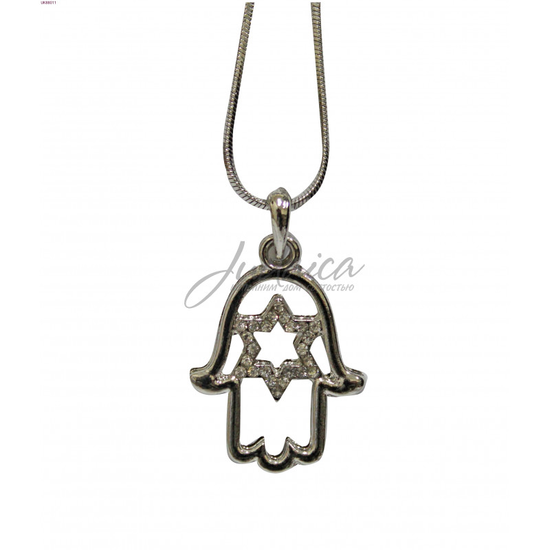 Цепочка серебристого цвета с элегантной двойной подвеской в форме Хамси, внутри которой находится Звезда Давида, украшенная мелкой россыпью фианитов. Отличный выбор на подарок!