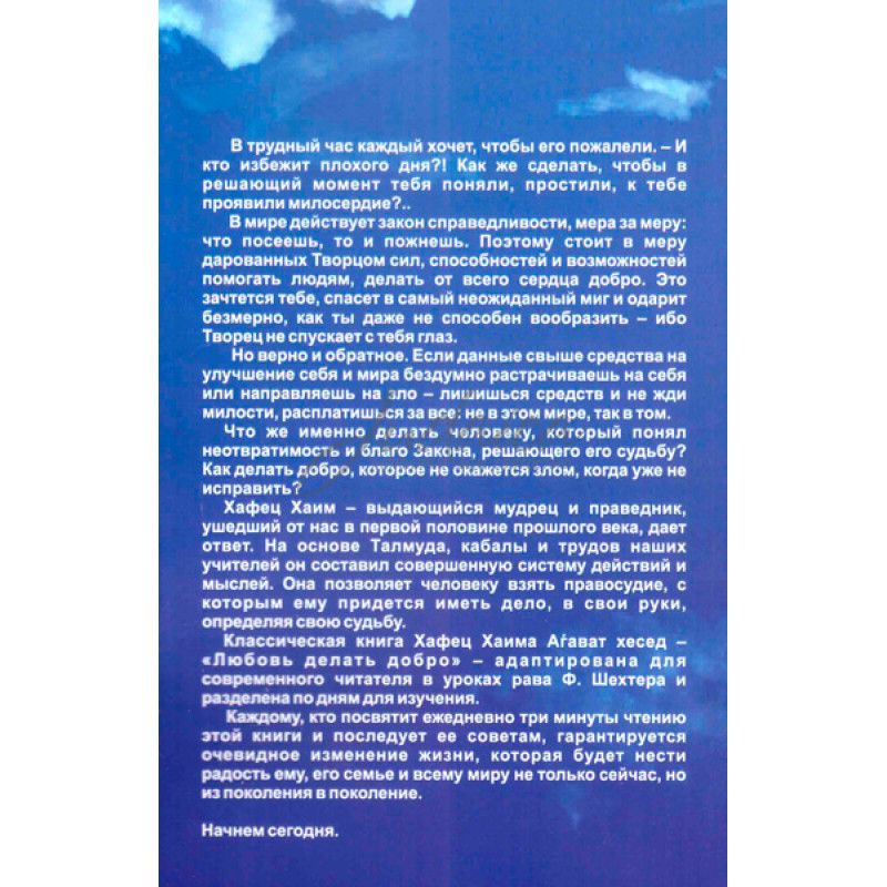 Ответ на этот вопрос предлагает Хафец Хаим, выдающийся мудрец и праведник прошлого века. Опираясь на Талмуд, каббалу и учения предков, он создал систему, позволяющую каждому взять судьбу в свои руки. Его книга "Агават Хесед" ("Любовь к добру"), адаптированная равом Ф. Шехтером и разбитая по дням для удобства изучения, становится проводником в мир добрых дел.