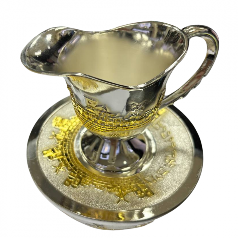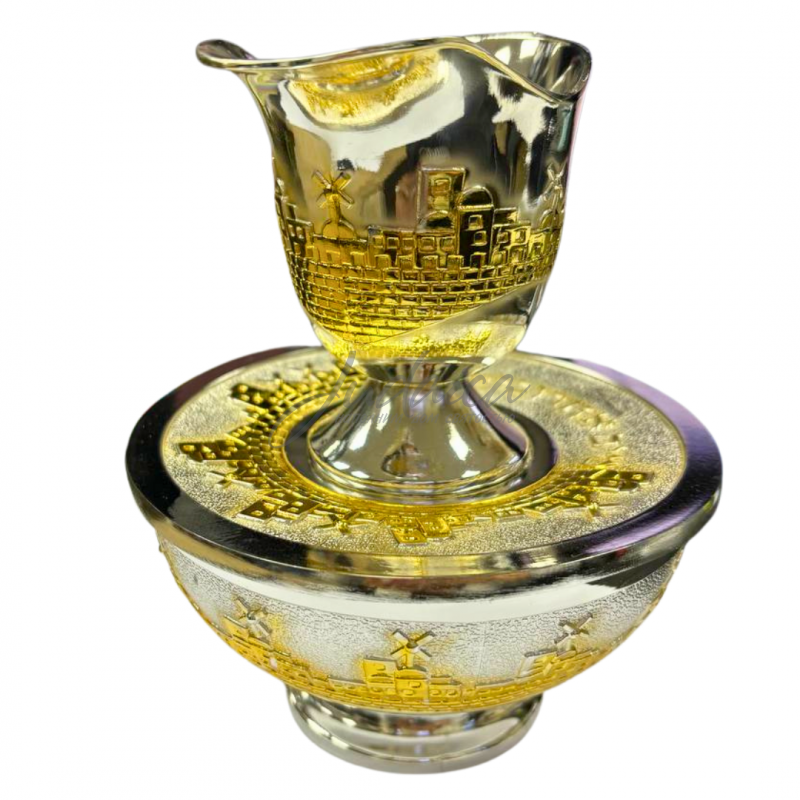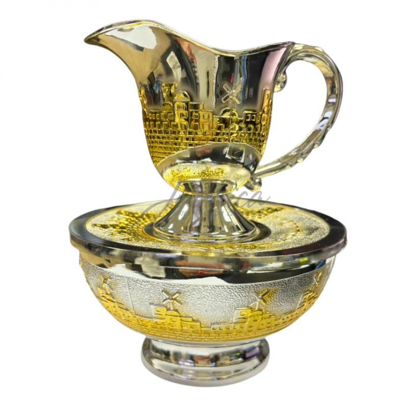 Маим Ахроним "Золотой Иерусалим" представляет собой изысканный набор для обряда мытья рук после трапезы в еврейской традиции. На элементах набора изображены мотивы старинного Иерусалима, что добавляет глубокий исторический и культурный контекст. Маим Ахроним 'Золотой Иерусалим'" не только практичен в использовании, но и служит украшением стола и напоминанием о богатом наследии и традициях еврейского народа.
