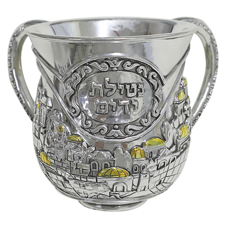 Необычайно красивый сосуд для омовения рук (натла) с объемным изображением Иерусалима, узорами и благословением "Натилат Ядаим". Золотистые крыши домов замечательно подчеркивают величие города и несомненно являются изюминкой этого нателатника.