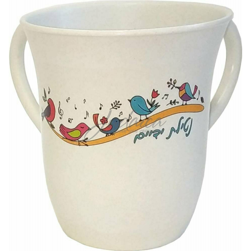 Специальная кружка для омовения рук (обряд "Нетилат ядаим"), изготовлена из пластика с тематикой райских птиц.